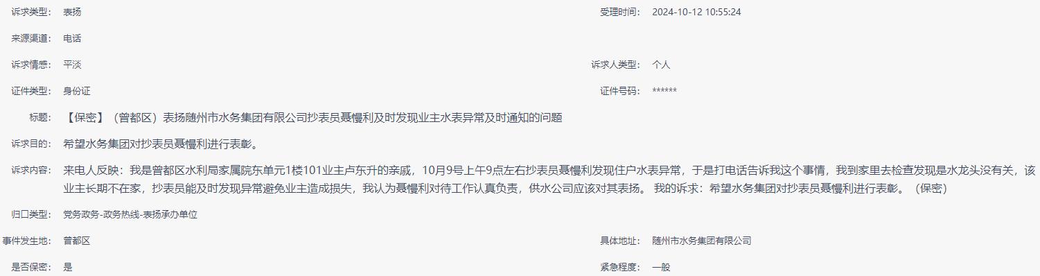 【保密】(曾都區(qū))表揚(yáng)隨州市水務(wù)集團(tuán)有限公司抄表員聶慢利及時(shí)發(fā)現(xiàn)業(yè)主水表異常及時(shí)通知的問題 |