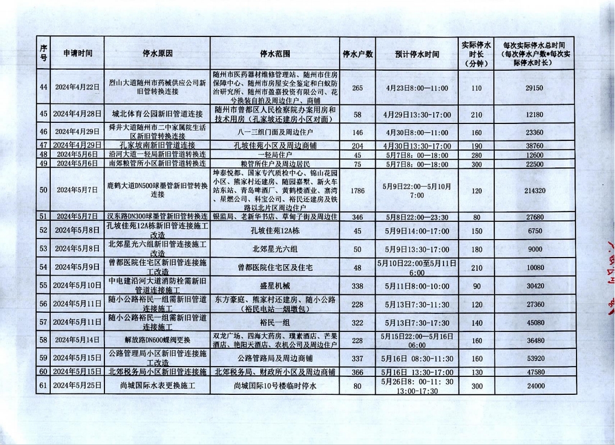 隨州市2023年9月至2024年8月計(jì)劃性停水資料